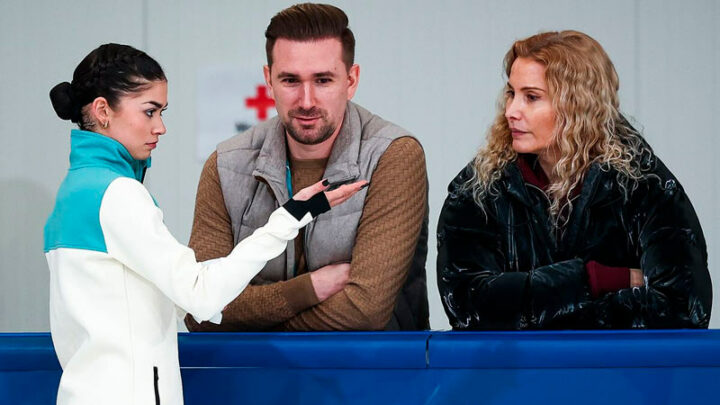 Фото: sport24.ru 16 февраля 2026 года, Милан. Тренеру Этери Тутберидзе разрешено присутствовать на тренировках Аделии Петросян на Олимпиаде. Но во время выступлений на лед нашу фигуристку выводит Даниил Глейхенгауз (в центре).