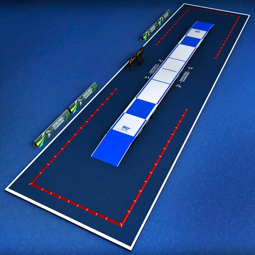 Стандартные размеры — 14 метров в длину и от 1.5 до 2 м в ширину. Такая конфигурация вынуждает спортсменов работать преимущественно в продольном направлении, тщательно контролируя дистанцию.