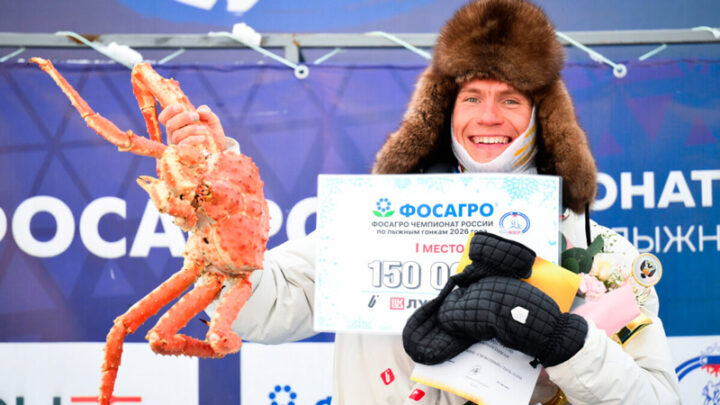 Фото: РИА Новости 8 марта 2026 года, Южно-Сахалинск. За победу в марафоне на чемпионате России Александру Большунову, кроме золотой медали и призовых денег, вручили здоровенного краба.