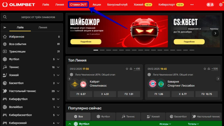 - Нажать в шапке на клавишу «Ставки 24/7».