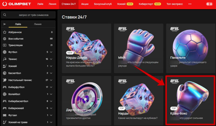 Игра доступна на официальном сайте, а также в мобильных приложениях Олимпбет на Андроид и Айфон (iOS). Для примера показано, как найти ее в десктопной версии конторы: