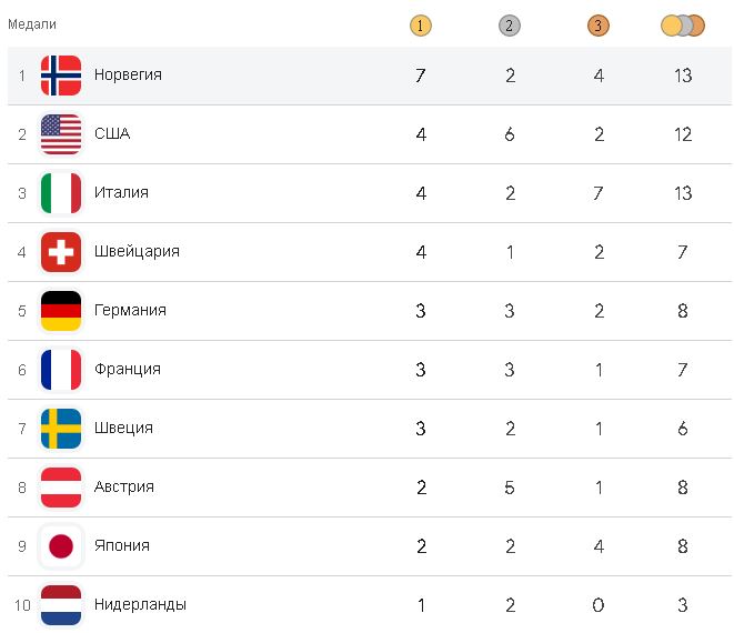Лидером общего зачета остается сборная Норвегии, в активе которой 13 медалей — семь золотых, две серебряные и четыре бронзовые.