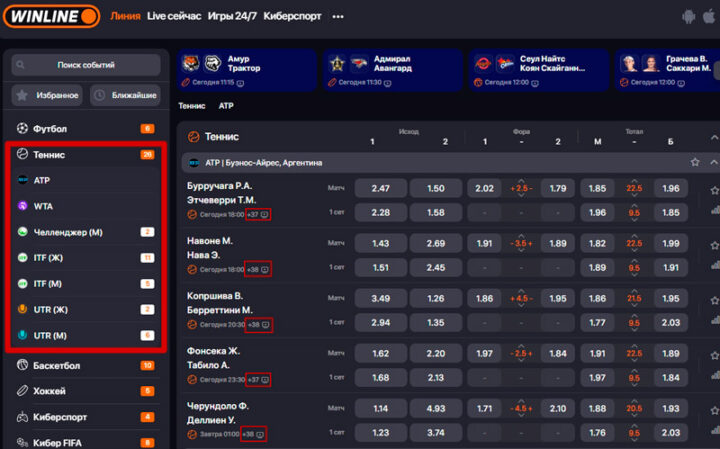 Также в линии доступны матчи серии ATP Challenger Tour и турниры ITF World Tennis Tour. Они менее значимые, однако идут практически круглый год, что дает возможность делать ставки на теннис в букмекерской конторе Winline непрерывно.