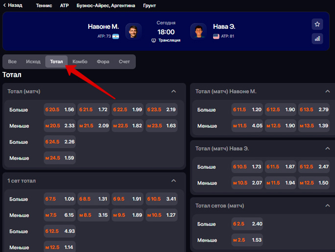 Это объединенный рынок внутри матча. В нем сочетаются два условия одновременно — например, победа теннисиста и тотал больше или меньше установленного значения.