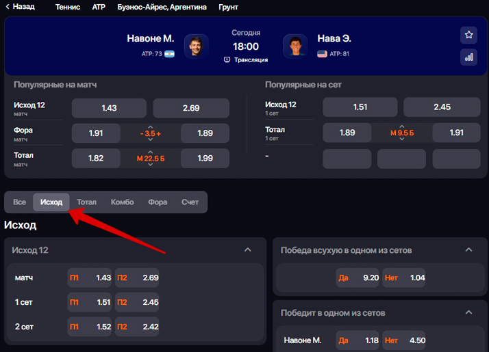 Самый простой вариант ставки на теннис в Winline — прогноз на победителя матча. В этом виде спорта нет ничьей, и рынок 1X2 состоит из двух позиций (12).