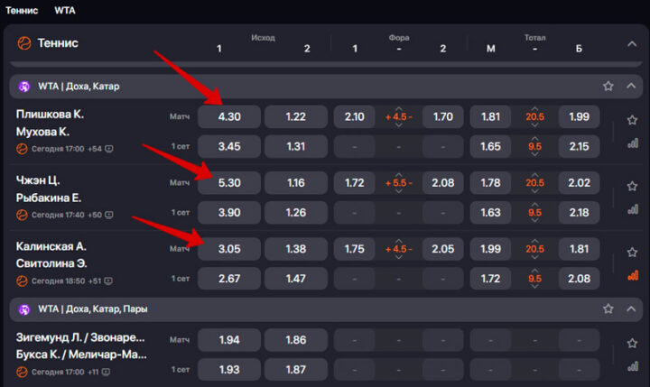 Прематч и лайв охватывают весь профессиональный календарь: турниры Большого шлема, серии ATP и WTA, а также Challenger и ITF. На крупных событиях роспись наиболее глубокая — от 40 исходов. Доступны такие варианты: победа в матче, форы по геймам и сетам, тоталы, точный счет, индивидуальные показатели, комбинированные рынки.